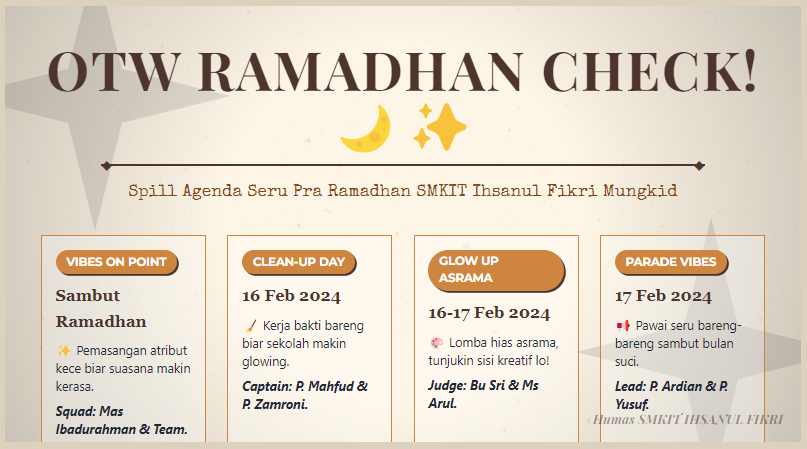 Mungkid, Magelang – SMKIT Ihsanul Fikri Mungkid, Kabupaten Magelang, menggelar serangkaian persiapan menyambut bulan Ramadan 1447H pada 14-17 Februari 2026. Kegiatan pra-Ramadhan ini bertujuan menciptakan suasana religius dan kebersamaan di lingkungan sekolah menjelang datangnya bulan puasa yang jatuh sekitar 19 Februari 2026.